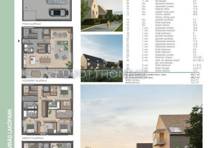 Luxus családi házak több, mint 300m2 lakóterülettel, panorámás tetőtéri terasszal, 4 beállós mélygarázzsal, biciklitárolóval, nagy kerttel és minden igényt kielégítő felszereltséggel.