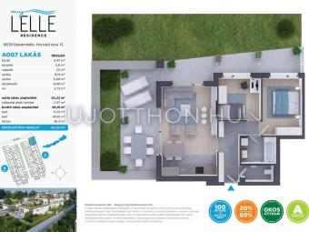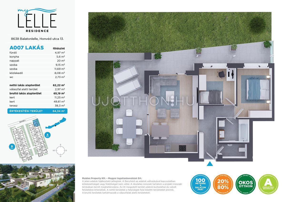 Legyen saját apartmanja a Balaton-parton, akár már 40 millió forinttól! Az újépítésű MyLelle Residence Balatonlelle szívében a Honvéd utcában, szinte a Balaton partján, mindössze 100 méterre a szabad strandtól kínál „A” energetikai besorolású apartmanokat. Az emberléptékűre tervezett, parkosított lakóparkban kétemeletes épületekben 74 darab lakás érhető el. Az alacsony fenntartást a korszerű építészeti és műszaki technológia és a megújuló energiafelhasználás (napelemek és hőszivattyús rendszer) biztosítja, így állandó ottlakásra vagy nyaralónak, de kiadásra is ideális lakásokat kínálunk – egy- és kéthálószobás kivitelben, eltérő méretű loggiával vagy terasszal, földszinti lakások esetében kertkapcsolattal. A lakóparktól néhány perc sétával elérhető a központ és a vasútállomás is.
