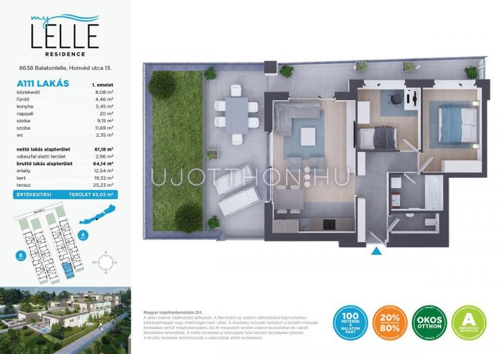Legyen saját apartmanja a Balaton-parton, akár már 40 millió forinttól! Az újépítésű MyLelle Residence Balatonlelle szívében a Honvéd utcában, szinte a Balaton partján, mindössze 100 méterre a szabad strandtól kínál „A” energetikai besorolású apartmanokat. Az emberléptékűre tervezett, parkosított lakóparkban kétemeletes épületekben 74 darab lakás érhető el. Az alacsony fenntartást a korszerű építészeti és műszaki technológia és a megújuló energiafelhasználás (napelemek és hőszivattyús rendszer) biztosítja, így állandó ottlakásra vagy nyaralónak, de kiadásra is ideális lakásokat kínálunk – egy- és kéthálószobás kivitelben, eltérő méretű loggiával vagy terasszal, földszinti lakások esetében kertkapcsolattal. A lakóparktól néhány perc sétával elérhető a központ és a vasútállomás is.