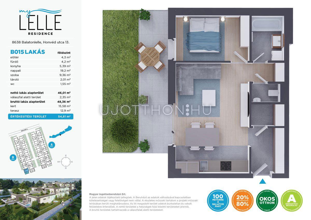 Legyen saját apartmanja a Balaton-parton, akár már 40 millió forinttól! Az újépítésű MyLelle Residence Balatonlelle szívében a Honvéd utcában, szinte a Balaton partján, mindössze 100 méterre a szabad strandtól kínál „A” energetikai besorolású apartmanokat. Az emberléptékűre tervezett, parkosított lakóparkban kétemeletes épületekben 74 darab lakás érhető el. Az alacsony fenntartást a korszerű építészeti és műszaki technológia és a megújuló energiafelhasználás (napelemek és hőszivattyús rendszer) biztosítja, így állandó ottlakásra vagy nyaralónak, de kiadásra is ideális lakásokat kínálunk – egy- és kéthálószobás kivitelben, eltérő méretű loggiával vagy terasszal, földszinti lakások esetében kertkapcsolattal. A lakóparktól néhány perc sétával elérhető a központ és a vasútállomás is.