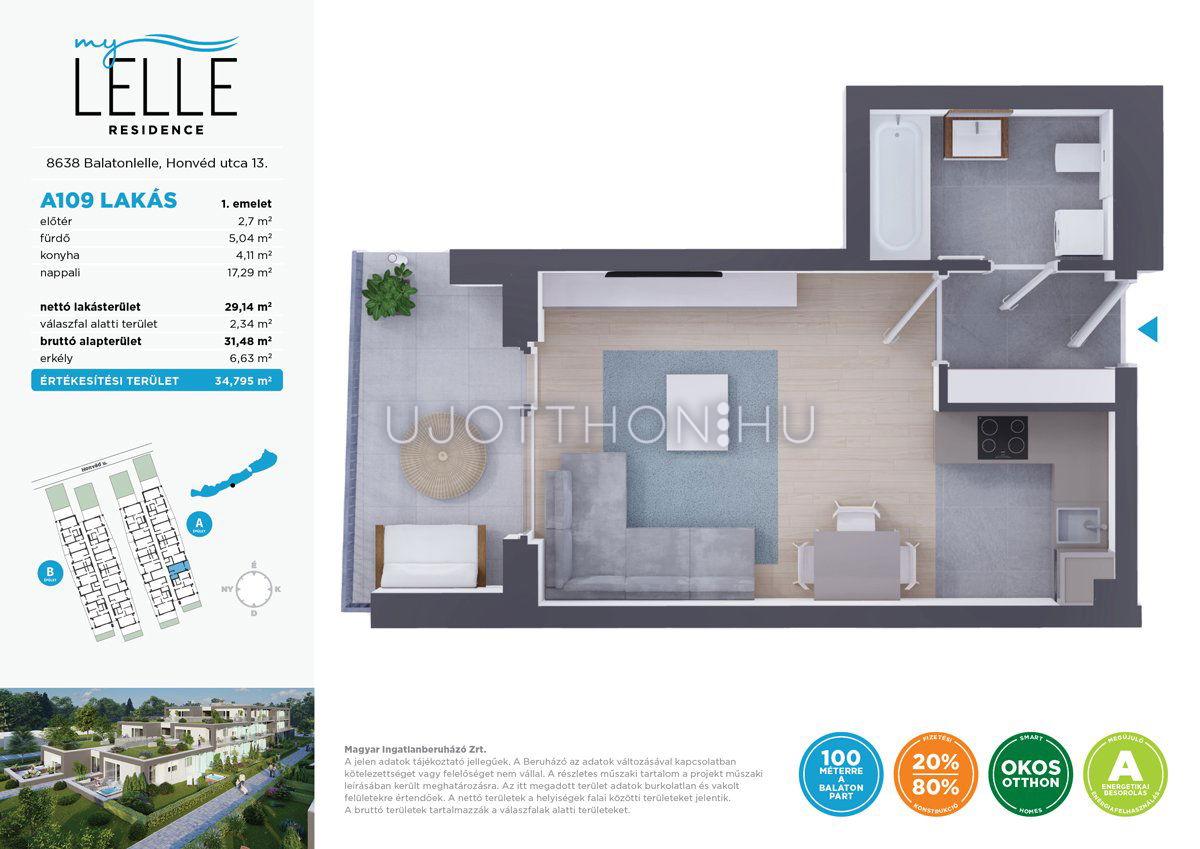 Legyen saját apartmanja a Balaton-parton, akár már 40 millió forinttól! Az újépítésű MyLelle Residence Balatonlelle szívében a Honvéd utcában, szinte a Balaton partján, mindössze 100 méterre a szabad strandtól kínál „A” energetikai besorolású apartmanokat. Az emberléptékűre tervezett, parkosított lakóparkban kétemeletes épületekben 74 darab lakás érhető el. Az alacsony fenntartást a korszerű építészeti és műszaki technológia és a megújuló energiafelhasználás (napelemek és hőszivattyús rendszer) biztosítja, így állandó ottlakásra vagy nyaralónak, de kiadásra is ideális lakásokat kínálunk – egy- és kéthálószobás kivitelben, eltérő méretű loggiával vagy terasszal, földszinti lakások esetében kertkapcsolattal. A lakóparktól néhány perc sétával elérhető a központ és a vasútállomás is.