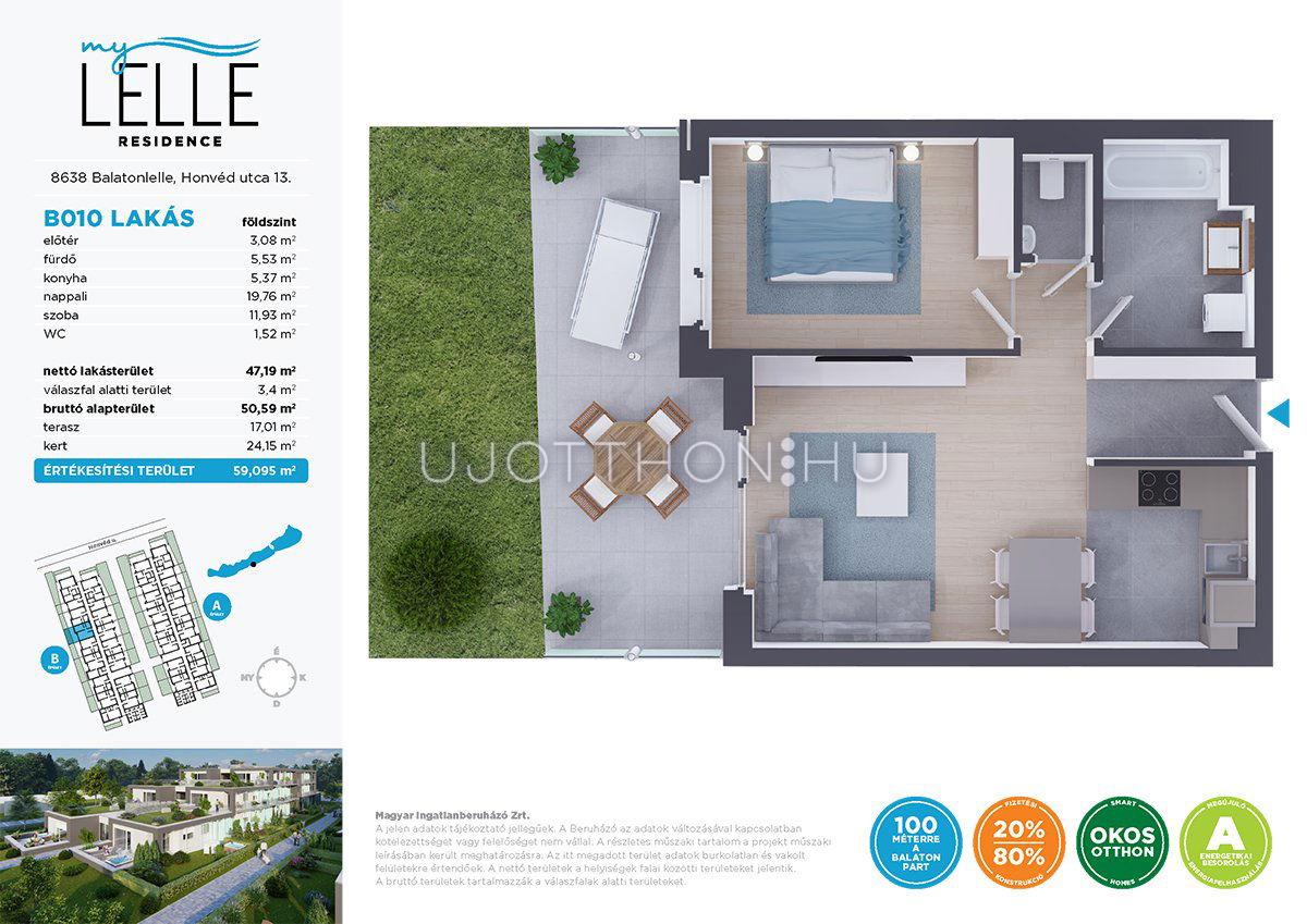 Legyen saját apartmanja a Balaton-parton, akár már 40 millió forinttól! Az újépítésű MyLelle Residence Balatonlelle szívében a Honvéd utcában, szinte a Balaton partján, mindössze 100 méterre a szabad strandtól kínál „A” energetikai besorolású apartmanokat. Az emberléptékűre tervezett, parkosított lakóparkban kétemeletes épületekben 74 darab lakás érhető el. Az alacsony fenntartást a korszerű építészeti és műszaki technológia és a megújuló energiafelhasználás (napelemek és hőszivattyús rendszer) biztosítja, így állandó ottlakásra vagy nyaralónak, de kiadásra is ideális lakásokat kínálunk – egy- és kéthálószobás kivitelben, eltérő méretű loggiával vagy terasszal, földszinti lakások esetében kertkapcsolattal. A lakóparktól néhány perc sétával elérhető a központ és a vasútállomás is.