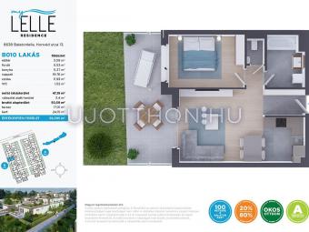 Legyen saját apartmanja a Balaton-parton, akár már 40 millió forinttól! Az újépítésű MyLelle Residence Balatonlelle szívében a Honvéd utcában, szinte a Balaton partján, mindössze 100 méterre a szabad strandtól kínál „A” energetikai besorolású apartmanokat. Az emberléptékűre tervezett, parkosított lakóparkban kétemeletes épületekben 74 darab lakás érhető el. Az alacsony fenntartást a korszerű építészeti és műszaki technológia és a megújuló energiafelhasználás (napelemek és hőszivattyús rendszer) biztosítja, így állandó ottlakásra vagy nyaralónak, de kiadásra is ideális lakásokat kínálunk – egy- és kéthálószobás kivitelben, eltérő méretű loggiával vagy terasszal, földszinti lakások esetében kertkapcsolattal. A lakók a szomszédos Lelle Hotel kertjéből percek alatt lesétálhatnak a sekély vizű szabad strandra és a hotel szolgáltatásait (játszótér, bár, szauna, kültéri fitneszpark, gyermekmedence) is ingyenesen használhatják. A lakóparktól néhány perc sétával elérhető a központ és a vasútállomás is. " "Balatonlelle a déli part egyik turisztikai központja. A városban minden megtalálható: sekély víz, szabadstrand, rengeteg jó étterem, halászcsárda, pub, pezsgő éjszakai élet, bulihelyek, szabadtéri programok, koncertek – és kerékpáros távolságra a Somogyi-dombság. Bevásárlóközpontok, óvoda, iskola, sportcentrum, szórakoztató és kulturális események biztosítják a városi életet kedvelők igényeit. A fővárosból is könnyen megközelíthető autóval és tömegközlekedéssel egyaránt. Igazi kuriózum, hogy Balatonlellén több mint 4 kilométeres partszakaszon lehet ingyen strandolni, sőt, a Napfény-strand és élményfürdő homokos partja igazi tengerparti hangulatot varázsol - mindössze néhány percre a My Lelle Residence-től.