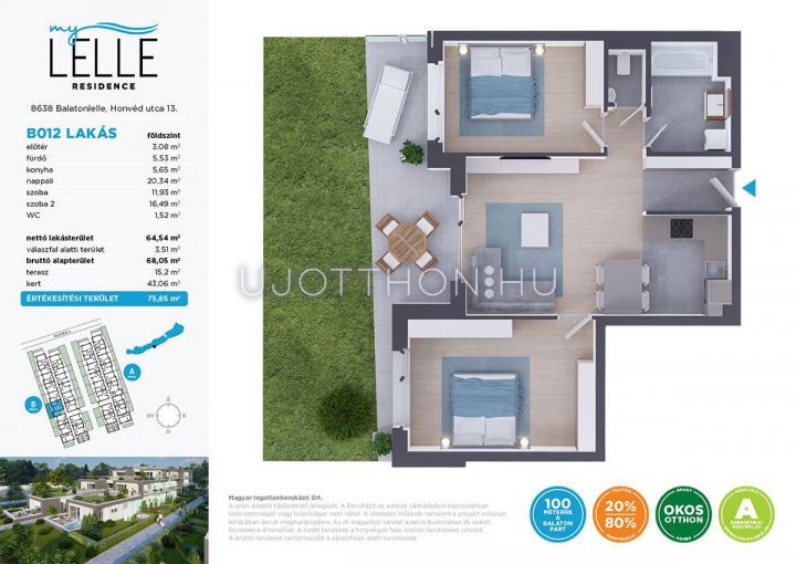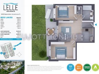 Legyen saját apartmanja a Balaton-parton, akár már 40 millió forinttól! Az újépítésű MyLelle Residence Balatonlelle szívében a Honvéd utcában, szinte a Balaton partján, mindössze 100 méterre a szabad strandtól kínál „A” energetikai besorolású apartmanokat. Az emberléptékűre tervezett, parkosított lakóparkban kétemeletes épületekben 74 darab lakás érhető el. Az alacsony fenntartást a korszerű építészeti és műszaki technológia és a megújuló energiafelhasználás (napelemek és hőszivattyús rendszer) biztosítja, így állandó ottlakásra vagy nyaralónak, de kiadásra is ideális lakásokat kínálunk – egy- és kéthálószobás kivitelben, eltérő méretű loggiával vagy terasszal, földszinti lakások esetében kertkapcsolattal. A lakóparktól néhány perc sétával elérhető a központ és a vasútállomás is.