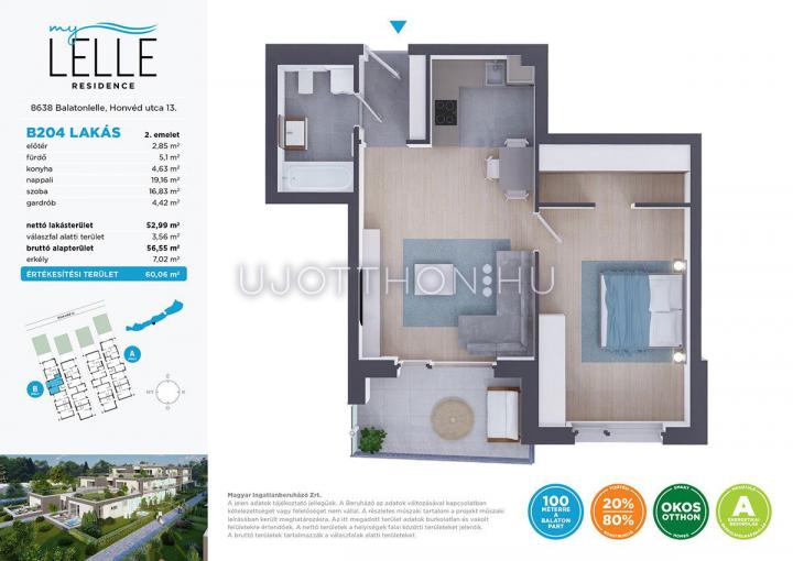 Legyen saját apartmanja a Balaton-parton, akár már 40 millió forinttól! Az újépítésű MyLelle Residence Balatonlelle szívében a Honvéd utcában, szinte a Balaton partján, mindössze 100 méterre a szabad strandtól kínál „A” energetikai besorolású apartmanokat. Az emberléptékűre tervezett, parkosított lakóparkban kétemeletes épületekben 74 darab lakás érhető el. Az alacsony fenntartást a korszerű építészeti és műszaki technológia és a megújuló energiafelhasználás (napelemek és hőszivattyús rendszer) biztosítja, így állandó ottlakásra vagy nyaralónak, de kiadásra is ideális lakásokat kínálunk – egy- és kéthálószobás kivitelben, eltérő méretű loggiával vagy terasszal, földszinti lakások esetében kertkapcsolattal. A lakóparktól néhány perc sétával elérhető a központ és a vasútállomás is.