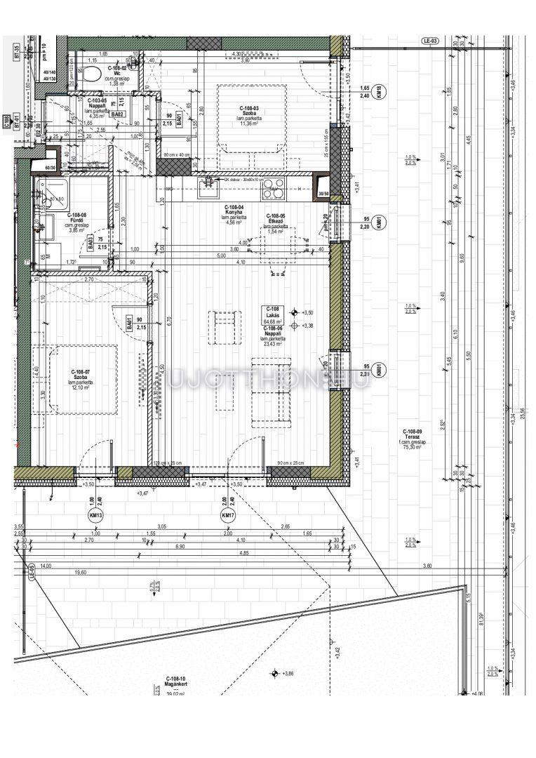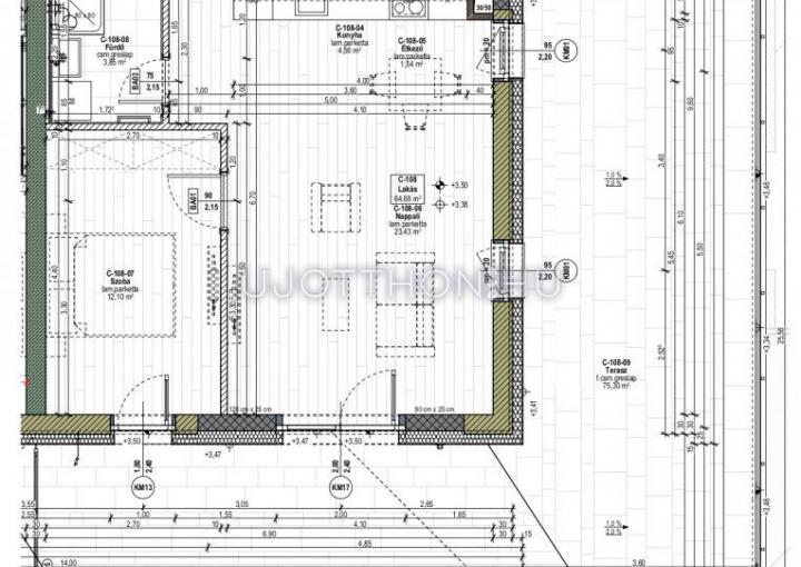 A lakás nettó alapterülete 62,56 m2 + 75,3 m2 terasz.