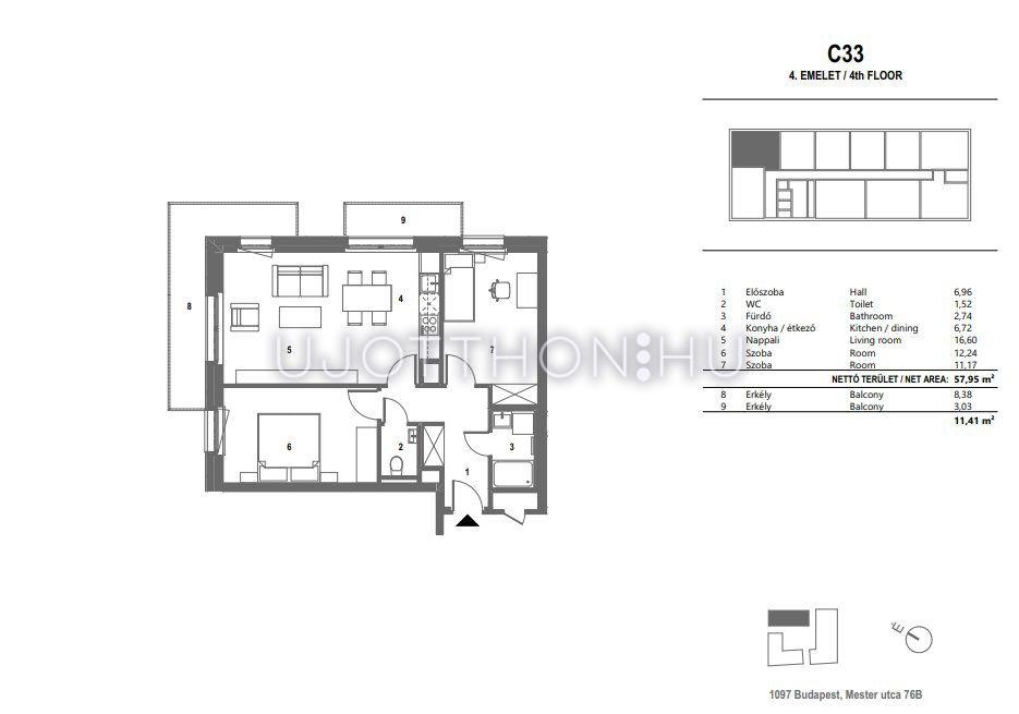 3 szobás 58 m2-es Lakás M76 Projekt - Budapest IX. kerület, Ferencváros, Mester utca 76/B