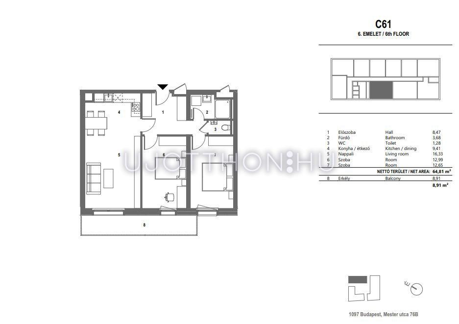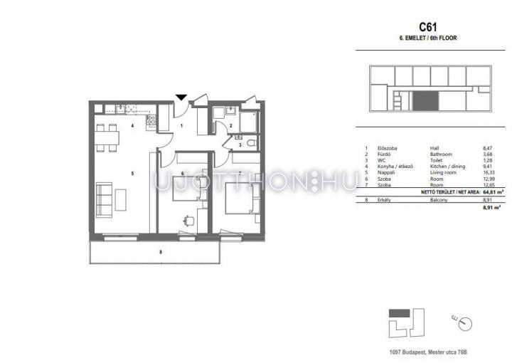 3 szobás 65 m2-es Lakás M76 Projekt - Budapest IX. kerület, Ferencváros, Mester utca 76/B