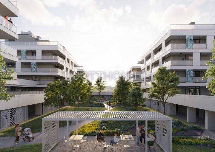 A kifinomult formavilágú épületekből álló lakópark impozáns, fákkal övezett belső kertje és igényes, családbarát közösségi terei garantálják a nyugodt, inspiráló környezetet. Mindez csupán karnyújtásnyira található számtalan szórakozási, sportolási és vásárlási lehetőségtől.