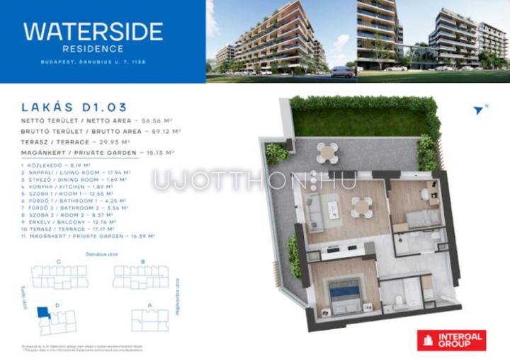 Waterside Residence egy AA+ energiaosztályú, modern lakópark a Duna-parton, Budapest 13. kerületében. Legjobb választás azok számára, akik egyszerre szeretnék élvezni a vízparti lét nyugalmát és a nagyváros előnyeit. A környék kényelmes közlekedéssel rendelkezik - a városközpont 10 perc alatt érhető el autóval. A környék fejlett infrastruktúrával rendelkezik és különböző szolgáltatások teljes spektrumát kínálja az itt lakók számára. A 4 épületből álló 9 emeletes lakóparkunk 317 lakást tartalmaz, melyeket közös földszinti aula köt össze. Kétszintes mélygarázst biztosítunk leendő tulajdonosaink számára. Impozáns belsőkertet terveztünk, melyben kialakításra került: játszótér, pihenő pavilon, sportolási lehetőség és egy kis dísztavavacska.