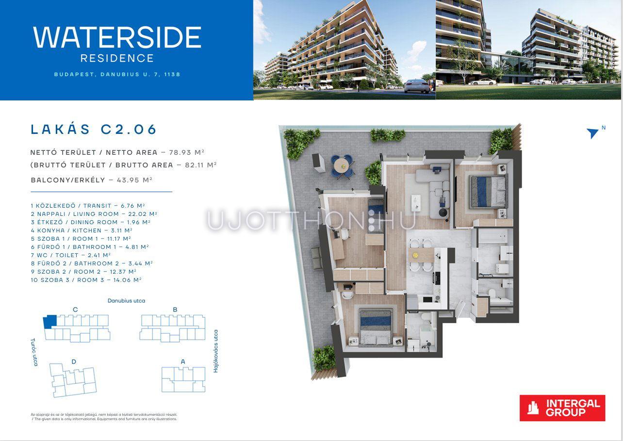 Waterside Residence egy AA+ energiaosztályú, modern lakópark a Duna-parton, Budapest 13. kerületében. Legjobb választás azok számára, akik egyszerre szeretnék élvezni a vízparti lét nyugalmát és a nagyváros előnyeit. A környék kényelmes közlekedéssel rendelkezik - a városközpont 10 perc alatt érhető el autóval. A környék fejlett infrastruktúrával rendelkezik és különböző szolgáltatások teljes spektrumát kínálja az itt lakók számára. A 4 épületből álló 9 emeletes lakóparkunk 317 lakást tartalmaz, melyeket közös földszinti aula köt össze. Kétszintes mélygarázst biztosítunk leendő tulajdonosaink számára. Impozáns belsőkertet terveztünk, melyben kialakításra került: játszótér, pihenő pavilon, sportolási lehetőség és egy kis dísztavavacska.