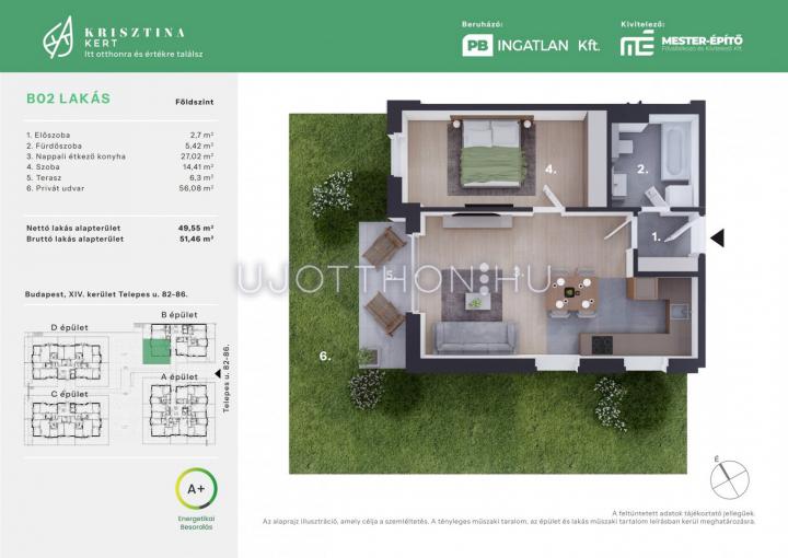 1 + 1 félszobás 50 m2-es Lakás Krisztina Kert - Budapest XIV. kerület, Alsórákos, Telepes utca 82-86