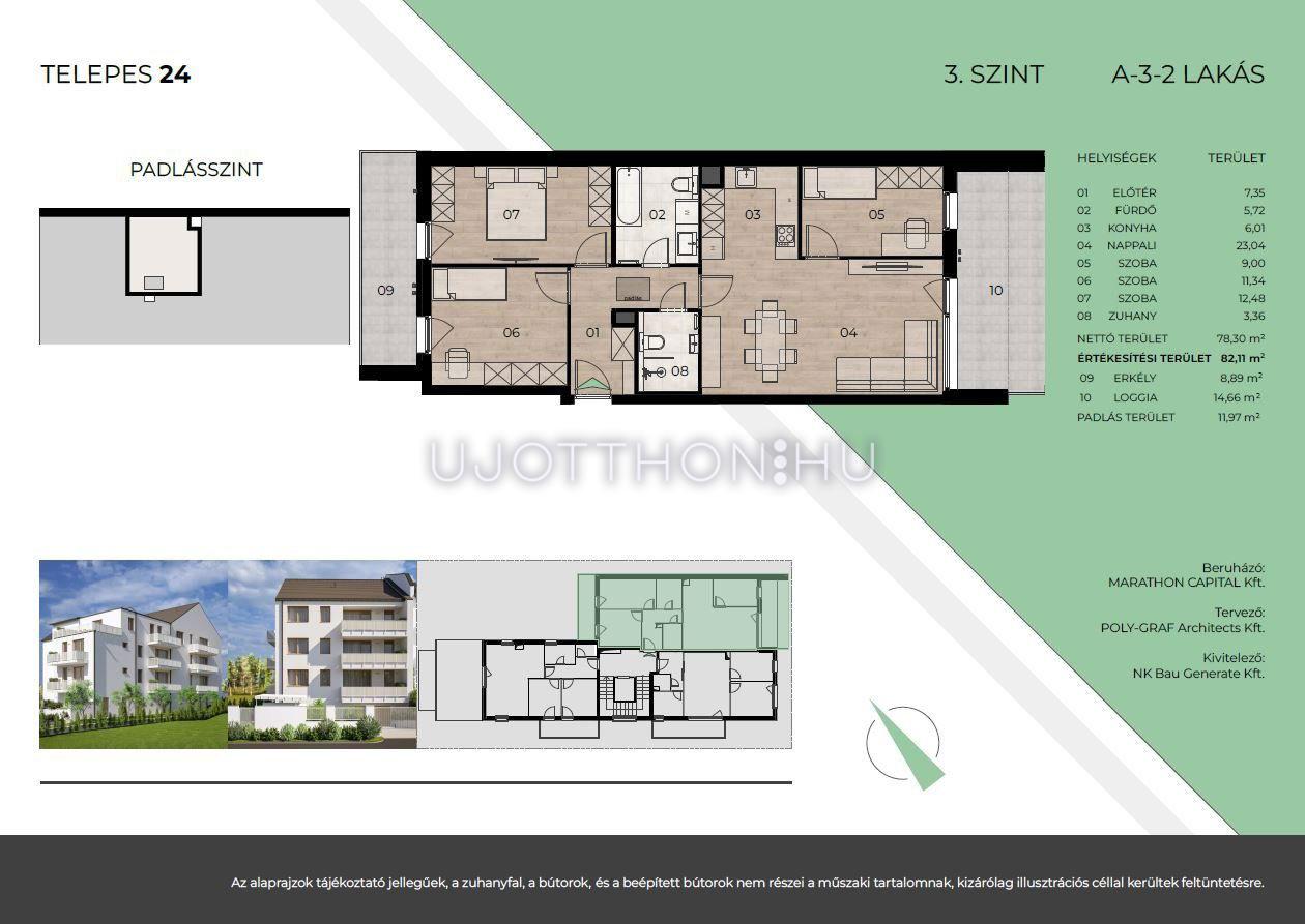 - Egyedi lehetőségek: az első emeleti hátsókerti lakáshoz 137 m²-es kizárólagos kertkapcsolat, míg a legfelső emeleti lakásokhoz 10-15 m²-es padlástér használati jog tartozik.