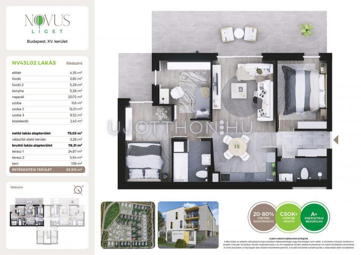 A Novus Liget Budapest 15. kerületének legújabb, modern lakóparkja, amelyet a fenntarthatóság és az élhető környezet jegyében álmodtak meg. A lakóparkban 40 társasház épül, összesen több mint 400, 2, 3 és 4 szobás lakással, amelyek tágas belső tereikkel, kertkapcsolattal vagy terasszal kínálnak kényelmet és nyugalmat. Az A+ energetikai besorolású épületek hőszivattyús rendszerrel és korszerű szigeteléssel készülnek, biztosítva az alacsony fenntartási költségeket és a környezetbarát megoldásokat.