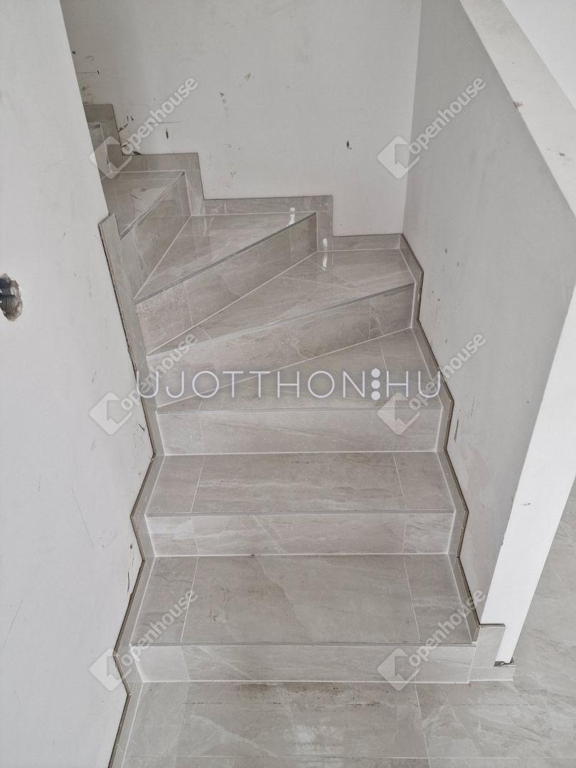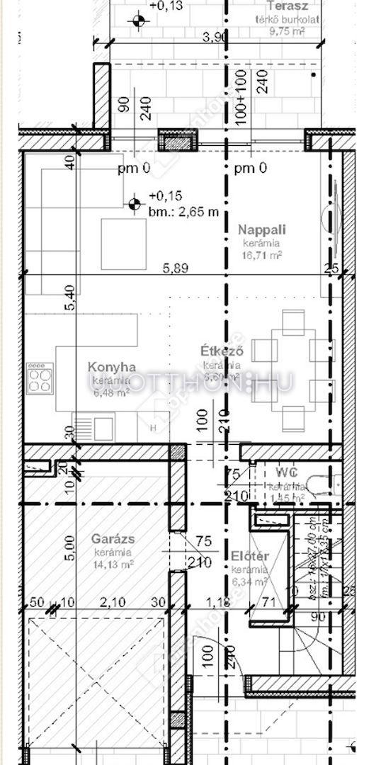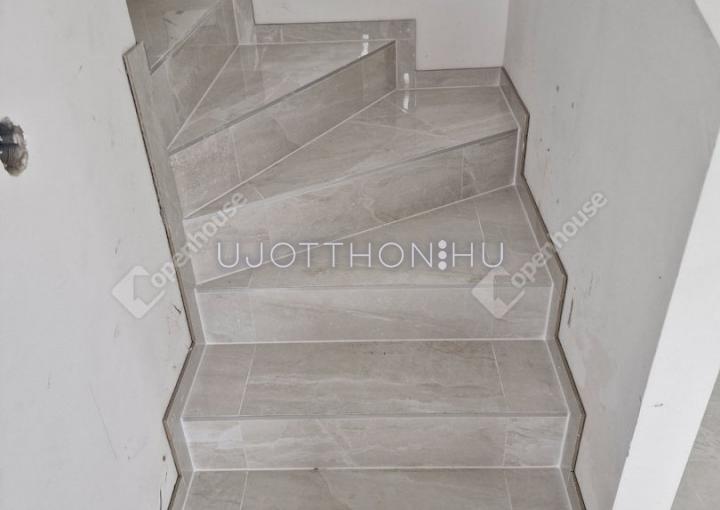 - Az alsó szinten van kialakítva a nappali-konyha-étkező egysége, melyhez egy 10 nm -es burkolt terasz kapcsolódik, illetve innen jutunk a 210 nm -es önálló kis kertben.