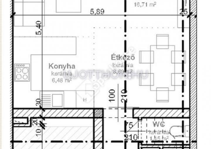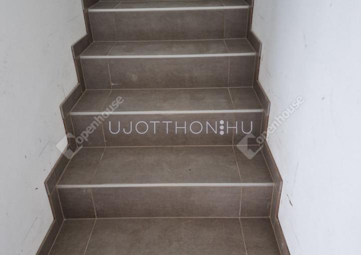 - Az alsó szinten van kialakítva a nappali-konyha-étkező egysége, melyhez egy 10 nm -es burkolt terasz kapcsolódik, illetve innen jutunk a 210 nm -es önálló kis kertben.