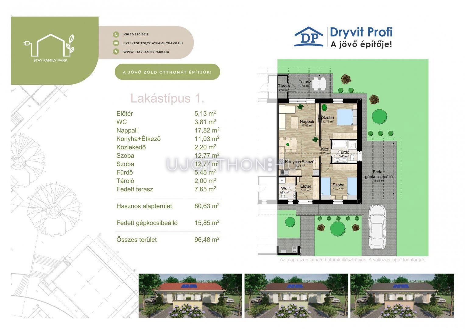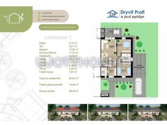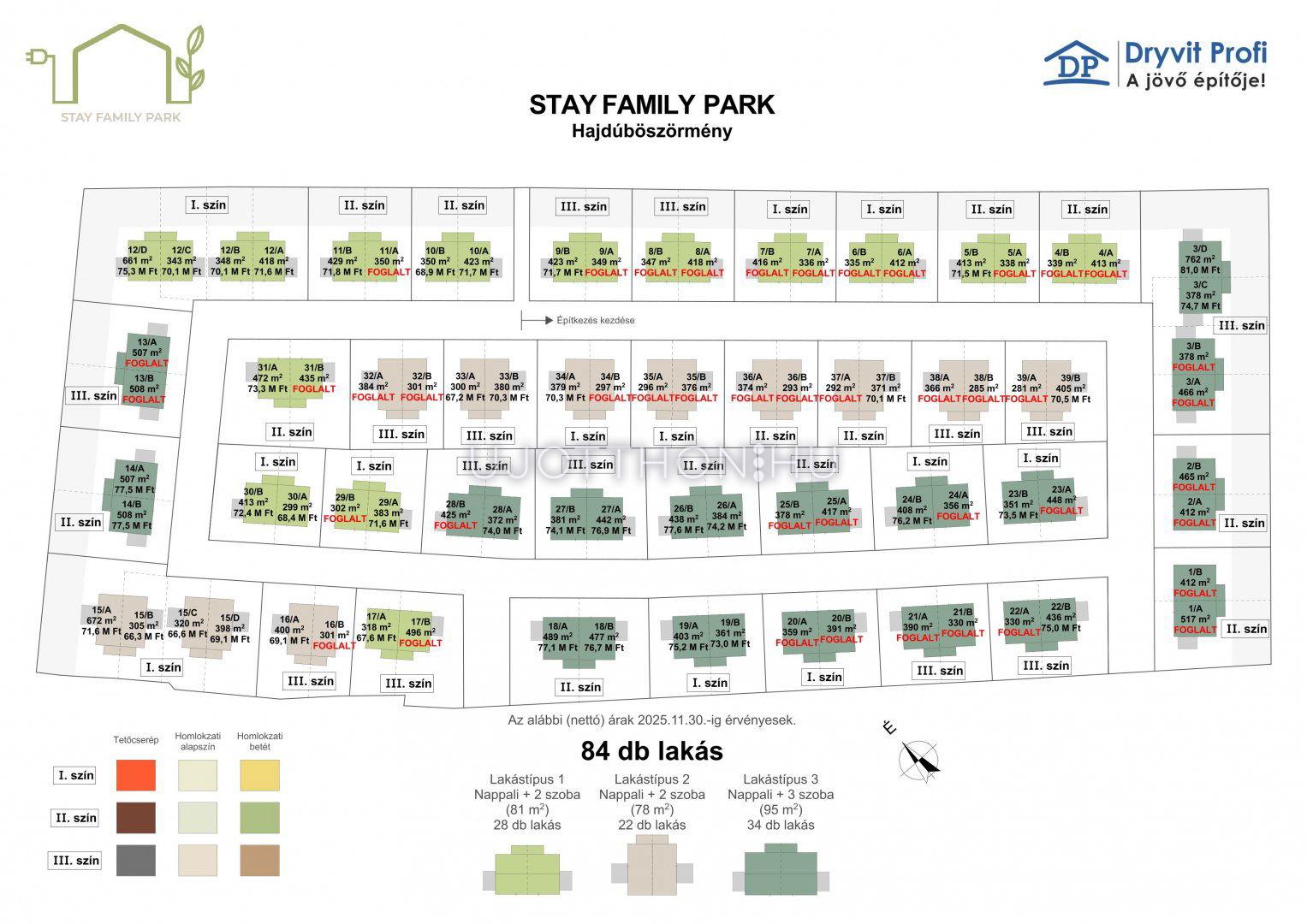 A 40.000 m2-es lakóparkban 84 db magas minőségű, kiváló ár-érték arányú otthont építünk, háromféle méretben, így a 78, 81 és 95 m2 hasznos alapterületű (nappali + 2 szobás/nappali + 3 szobás) lakások közül minden generáció megtalálhatja a számára legmegfelelőbbet. A lakások különböző telekméretű ikerházas ingatlanokon találhatóak. Az eladási ár ennek függvényében minden lakásnál egyedi. A lakás hasznos alapterületébe beletartozik a 8 m2-es fedett terasz. A feltüntetett árak nettó árak, és 2025. november 30-ig érvényesek.
