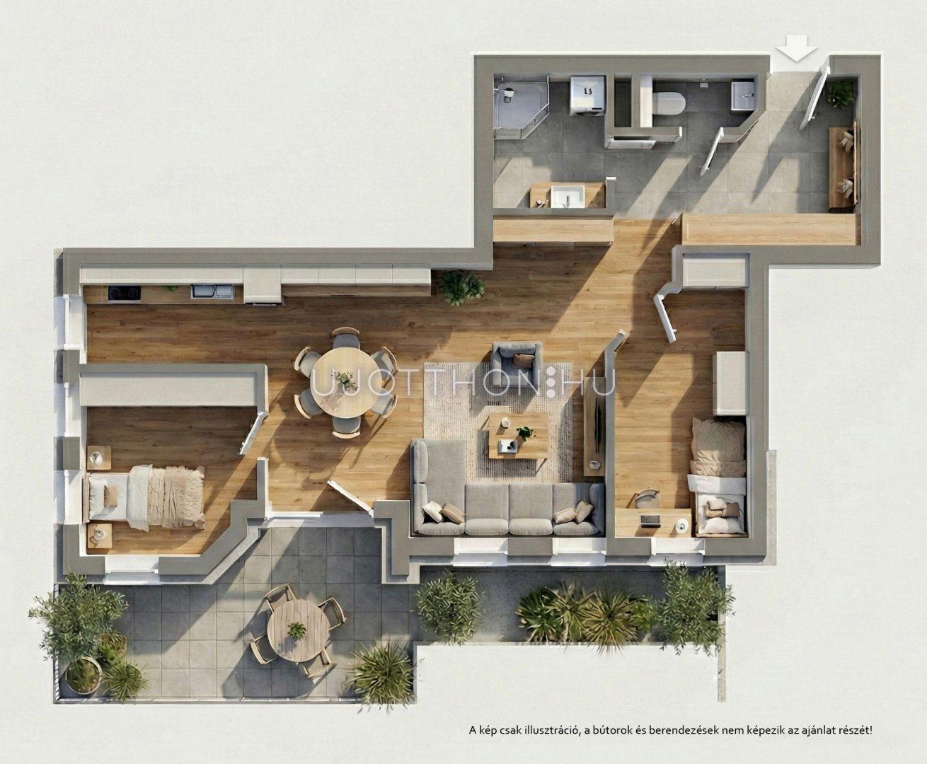A lakás 62,12 m2, melyhez 13,39 m2-es terasz tartozik.