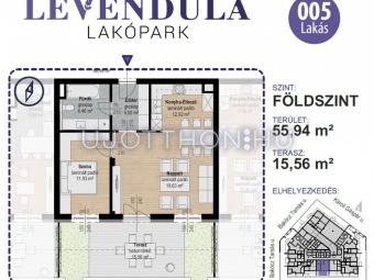 A lakás 55,66 m2, melyhez 15,56 m2-es terasz tartozik.
