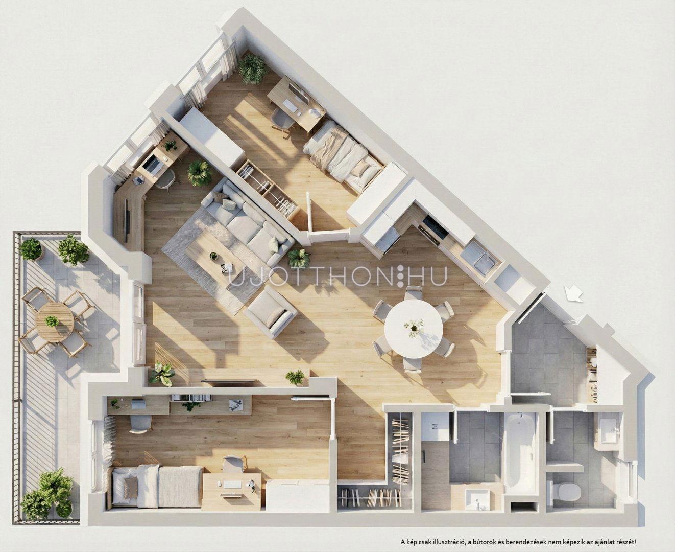 A lakás 66,98 m2, melyhez 10,09 m2-es terasz tartozik.