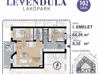 A lakás 64,6 m2 , melyhez 9,35 m2-es terasz tartozik.