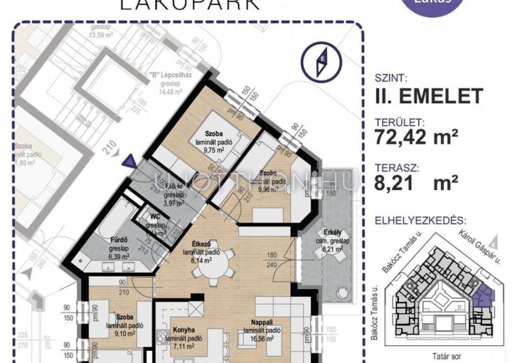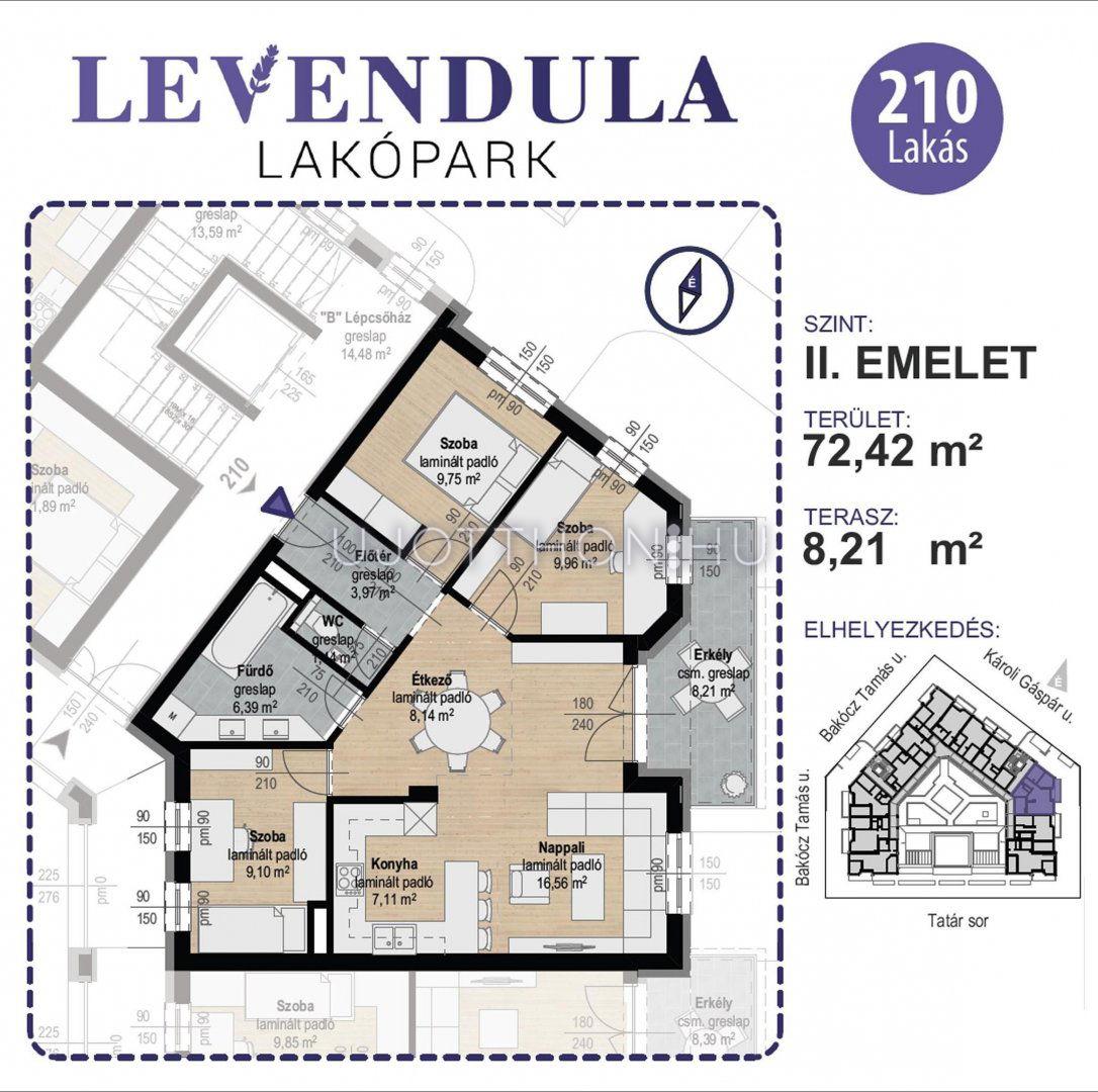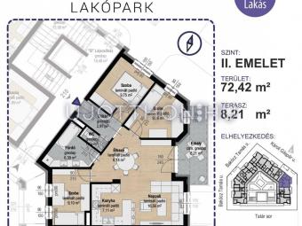 A lakás 72,42 m2, melyhez 8,21 m2-es terasz tartozik.