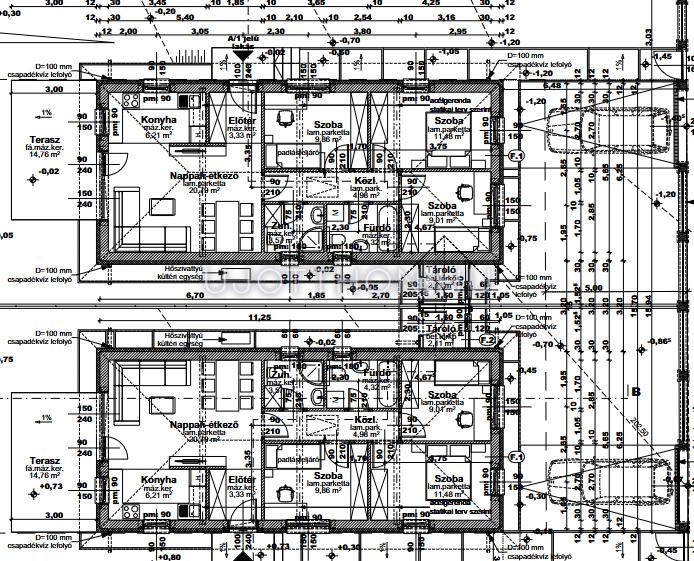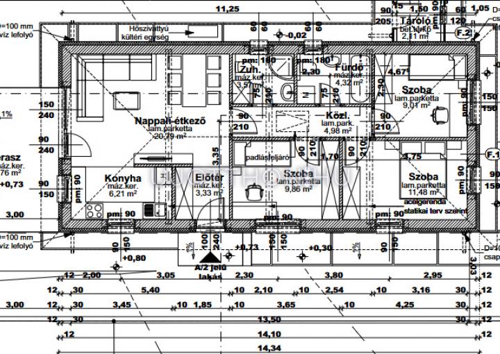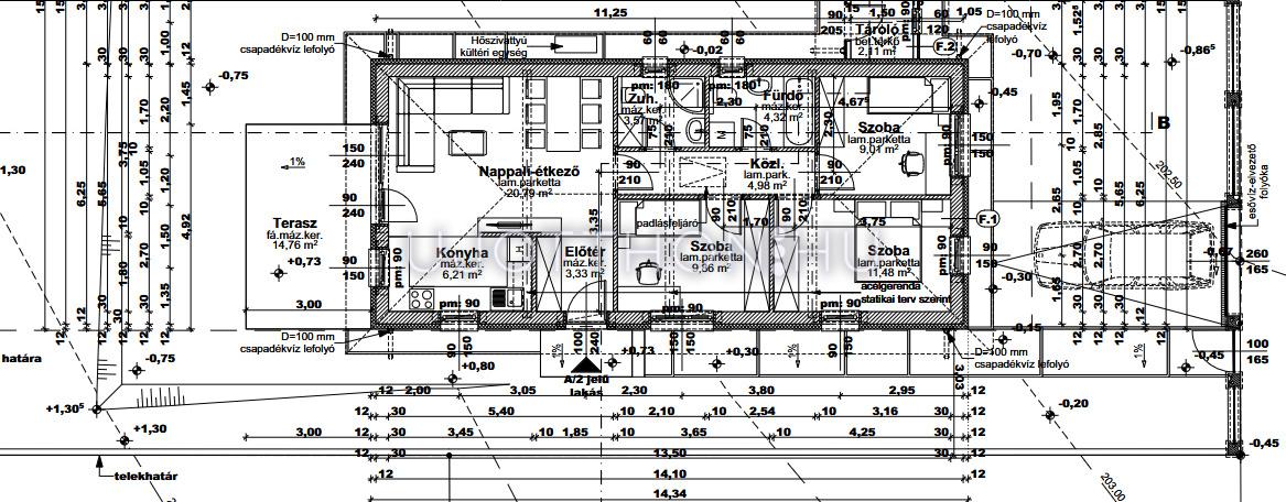 A ház nettó hasznos alapterülete 73,55 nm+2.11 nm tároló+14,76 nm terasz.