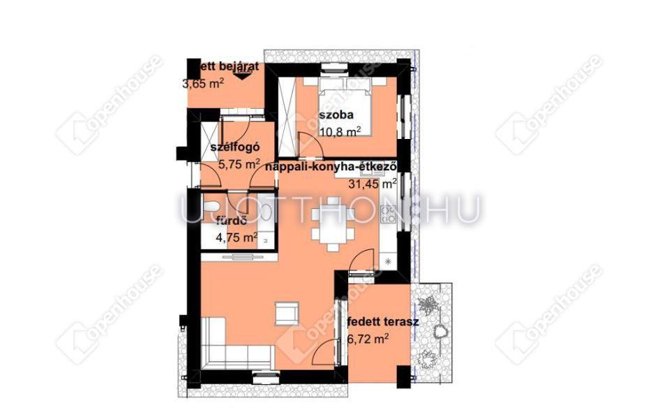 2 szobás (nappali+amerikai konyha+étkező+hálószoba+szélfogó+fürdő)