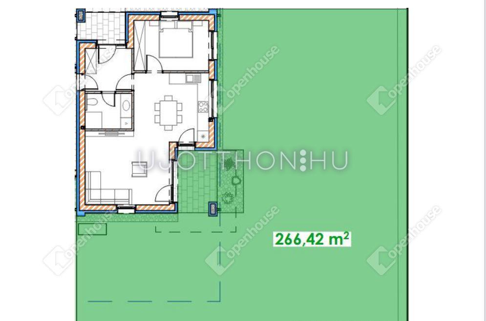 A lakáshoz kerítéssel elkerített saját kertrész tartozik, ami 266 m2