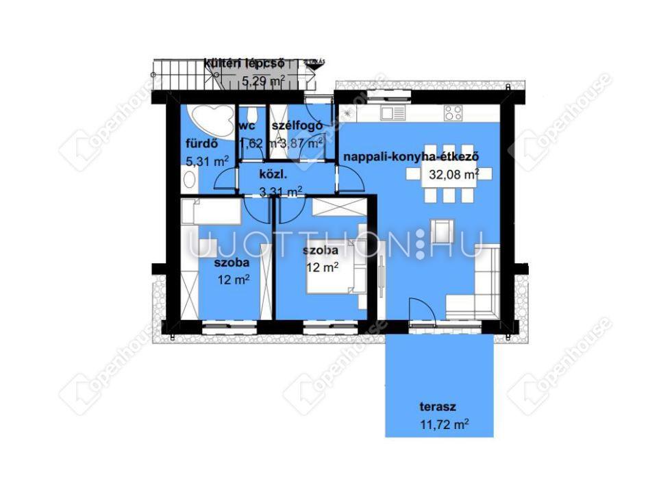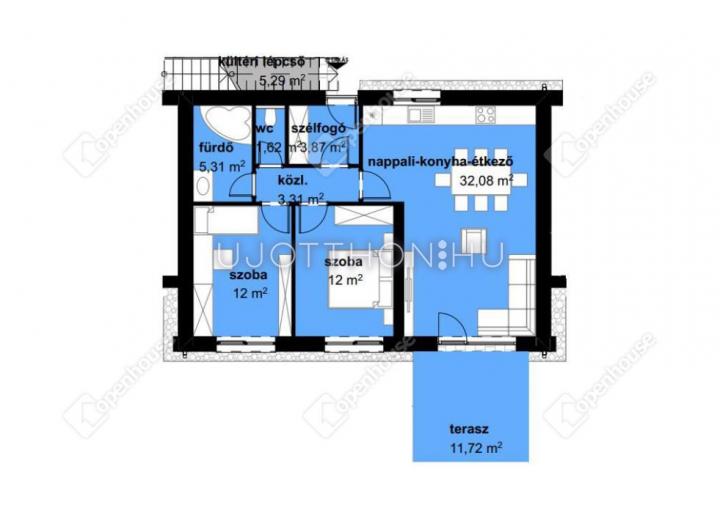 3 szobás (nappali+amerikai konyha+étkező+2 db hálószoba+szélfogó+fürdő+külön wc)