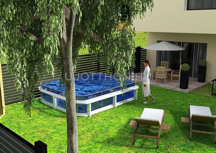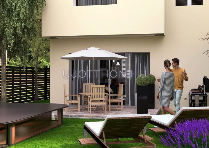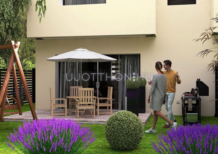 • Mindegyik lakáshoz tartozik saját kert/udvar. Némelyik lakásnak előkertje és oldalkertje is van. Az úgynevezett hátsó kertkapcsolat 180cm magas esztétikus kerítéssel körbe ölelt privát terület. A nappaliból lehet megközelíteni, kialakított teraszon keresztül.