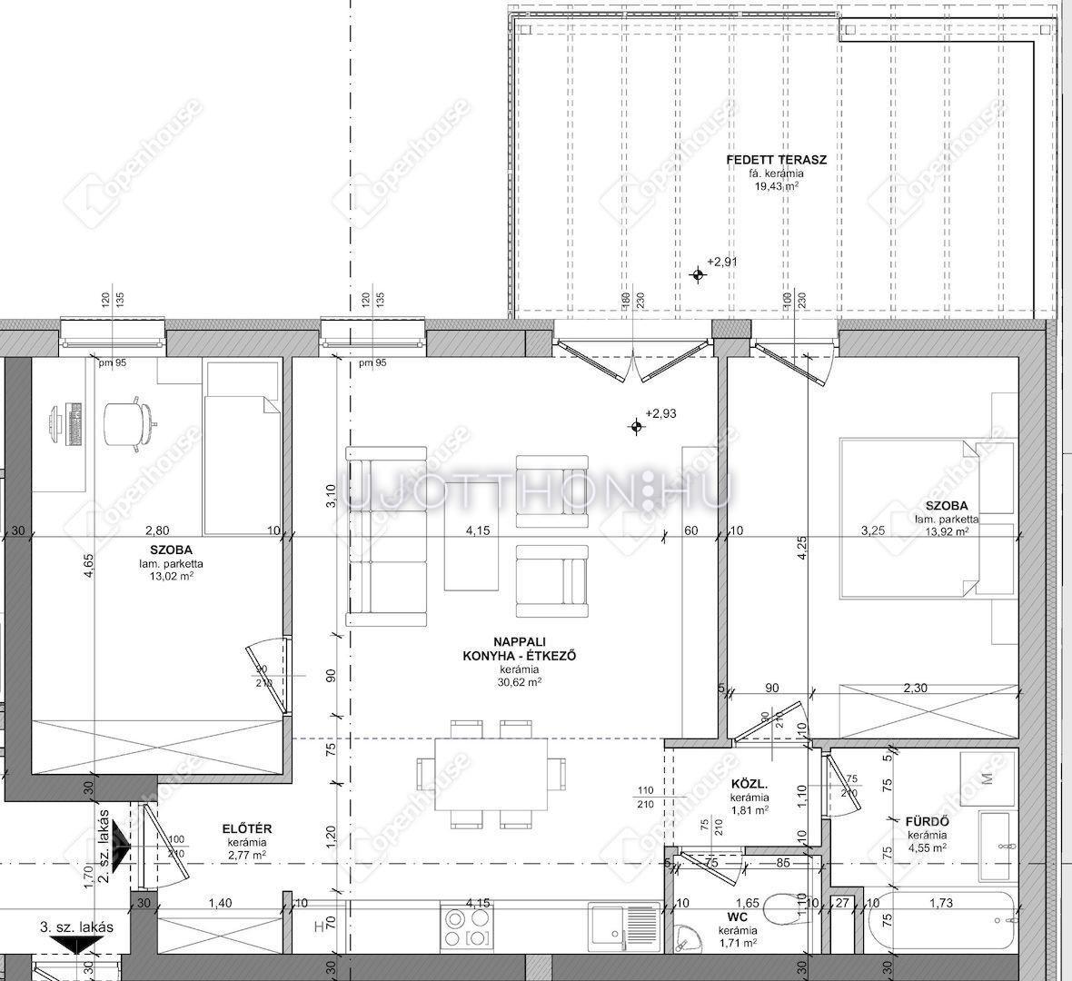 - KIVÁLÓ ELOSZTÁSÚ 68.32 NM-ES LAKÁS, két hálószoba, amerikai konyhás nappali, fürdőszoba, wc, 19.43 NM-ES FEDETT TERASZ ELOSZTÁSSAL RENDELKEZIK,