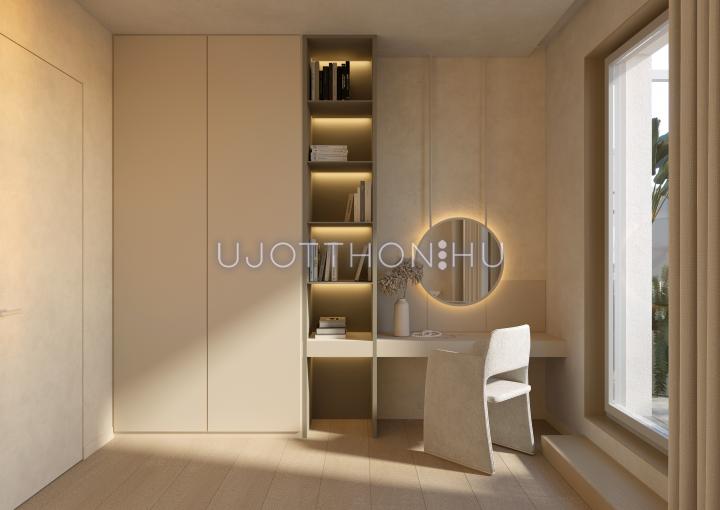 Nagy üvegfelületű, háromrétegű műanyag nyílászárókat építünk be, melyeket minden hálószobában redőnnyel és szúnyoghálóval egészítünk ki. A hőszivattyúról működtetett helyiségenként szabályozható mennyezeti hűtés-fűtés rendszerünk sok előnye mellett zajmentes, egységesen oszlatja el a hőt és egészségesebb, mint a klímával való hűtés.