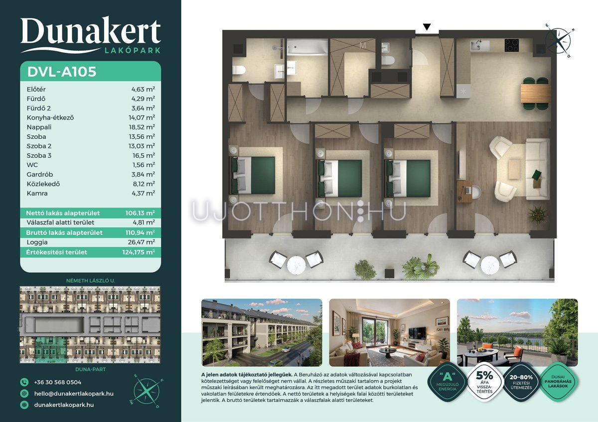 A Dunakert Lakópark Vác északi részén, a Németh László utcában épül, egy csendes, rendezett városrészben, közvetlenül a Duna-part mellett. A négyszintes épületben 152 modern, energiahatékony lakás kap helyet. A praktikus stúdióktól a nappali + több hálószobás családi otthonokig. Az emeleti lakásokhoz tágas terasz, a földszintiekhez saját kert tartozik, így minden lakó számára biztosított a privát kültéri tér és a természetkapcsolat.