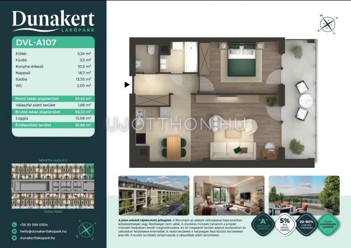 A Dunakert Lakópark Vác északi részén, a Németh László utcában épül, egy csendes, rendezett városrészben, közvetlenül a Duna-part mellett. A négyszintes épületben 152 modern, energiahatékony lakás kap helyet. A praktikus stúdióktól a nappali + több hálószobás családi otthonokig. Az emeleti lakásokhoz tágas terasz, a földszintiekhez saját kert tartozik, így minden lakó számára biztosított a privát kültéri tér és a természetkapcsolat.