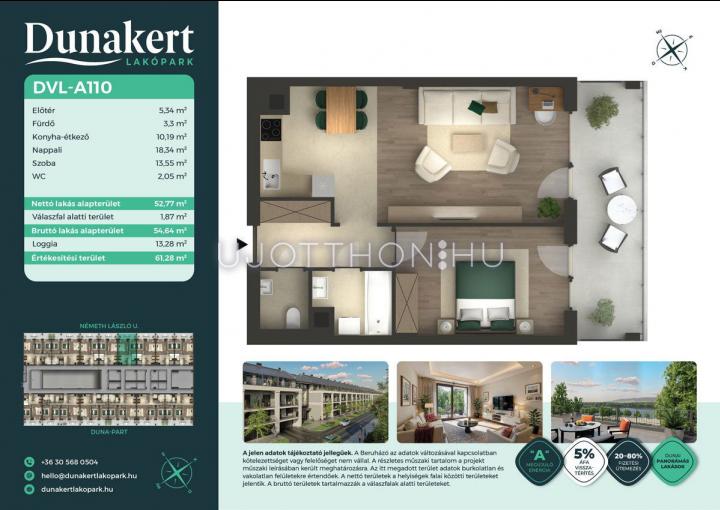 A Dunakert Lakópark Vác északi részén, a Németh László utcában épül, egy csendes, rendezett városrészben, közvetlenül a Duna-part mellett. A négyszintes épületben 152 modern, energiahatékony lakás kap helyet. A praktikus stúdióktól a nappali + több hálószobás családi otthonokig. Az emeleti lakásokhoz tágas terasz, a földszintiekhez saját kert tartozik, így minden lakó számára biztosított a privát kültéri tér és a természetkapcsolat.
