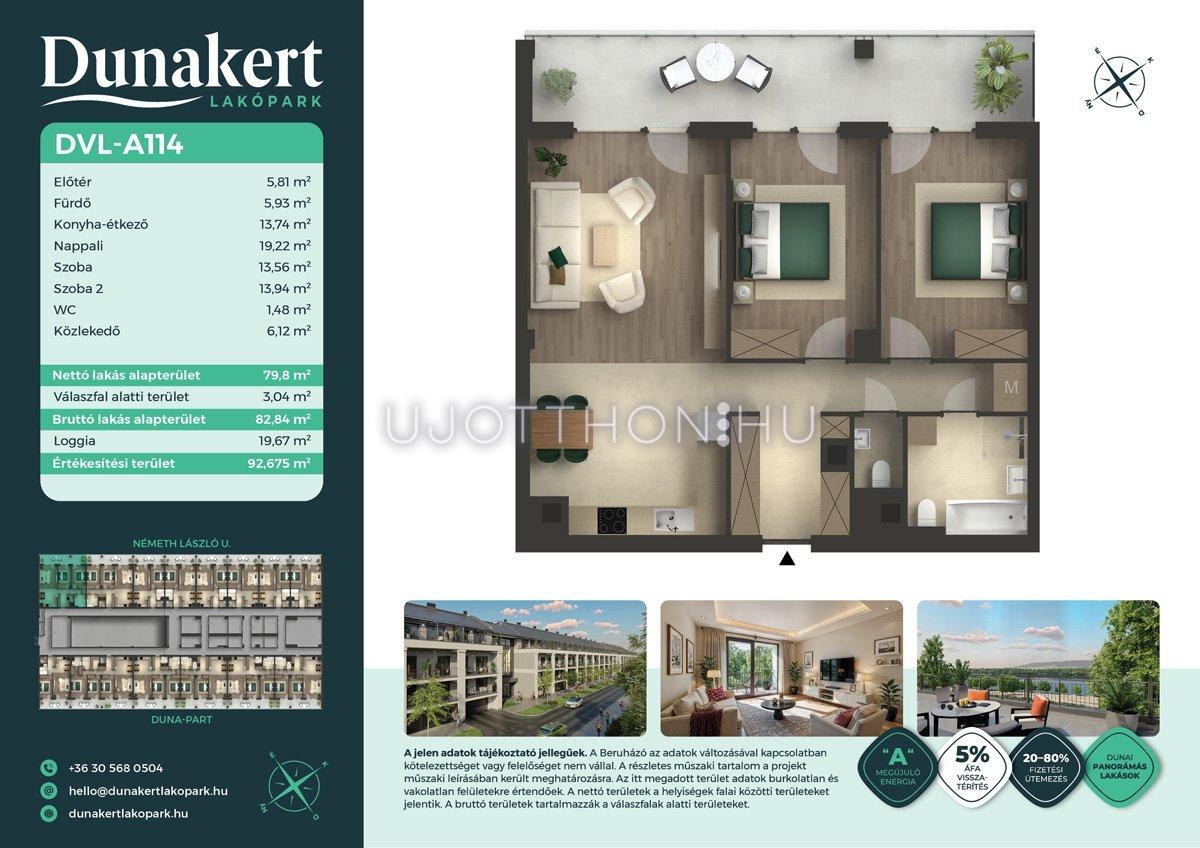 A Dunakert Lakópark Vác északi részén, a Németh László utcában épül, egy csendes, rendezett városrészben, közvetlenül a Duna-part mellett. A négyszintes épületben 152 modern, energiahatékony lakás kap helyet. A praktikus stúdióktól a nappali + több hálószobás családi otthonokig. Az emeleti lakásokhoz tágas terasz, a földszintiekhez saját kert tartozik, így minden lakó számára biztosított a privát kültéri tér és a természetkapcsolat.