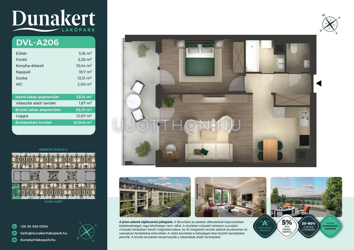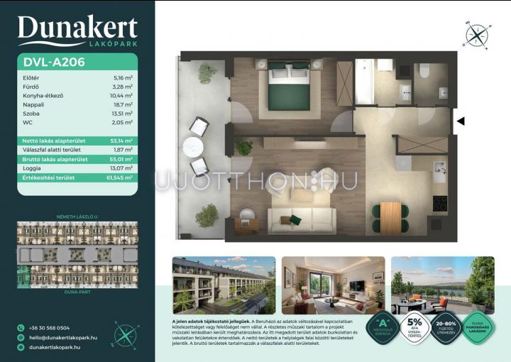 A Dunakert Lakópark Vác északi részén, a Németh László utcában épül, egy csendes, rendezett városrészben, közvetlenül a Duna-part mellett. A négyszintes épületben 152 modern, energiahatékony lakás kap helyet. A praktikus stúdióktól a nappali + több hálószobás családi otthonokig. Az emeleti lakásokhoz tágas terasz, a földszintiekhez saját kert tartozik, így minden lakó számára biztosított a privát kültéri tér és a természetkapcsolat.