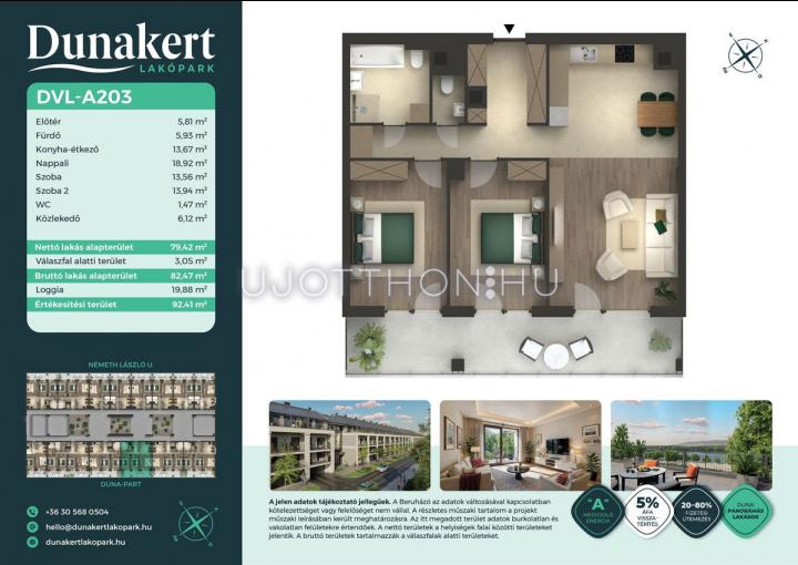 A Dunakert Lakópark Vác északi részén, a Németh László utcában épül, egy csendes, rendezett városrészben, közvetlenül a Duna-part mellett. A négyszintes épületben 152 modern, energiahatékony lakás kap helyet. A praktikus stúdióktól a nappali + több hálószobás családi otthonokig. Az emeleti lakásokhoz tágas terasz, a földszintiekhez saját kert tartozik, így minden lakó számára biztosított a privát kültéri tér és a természetkapcsolat.