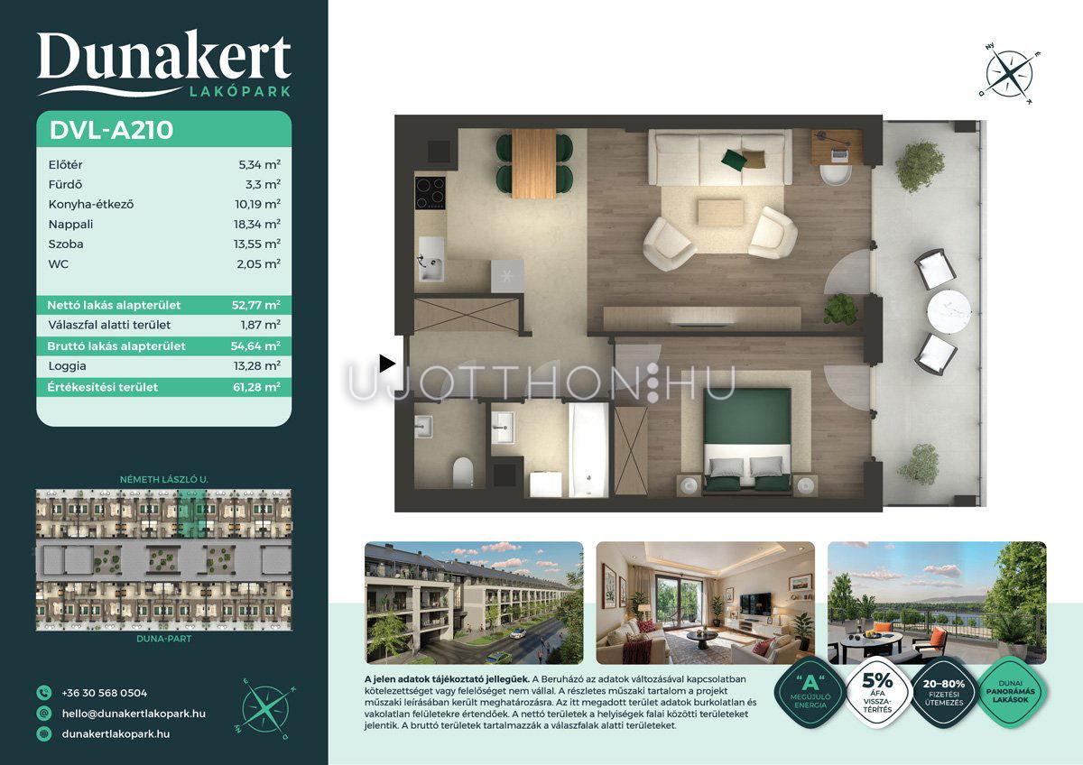 A Dunakert Lakópark Vác északi részén, a Németh László utcában épül, egy csendes, rendezett városrészben, közvetlenül a Duna-part mellett. A négyszintes épületben 152 modern, energiahatékony lakás kap helyet. A praktikus stúdióktól a nappali + több hálószobás családi otthonokig. Az emeleti lakásokhoz tágas terasz, a földszintiekhez saját kert tartozik, így minden lakó számára biztosított a privát kültéri tér és a természetkapcsolat.