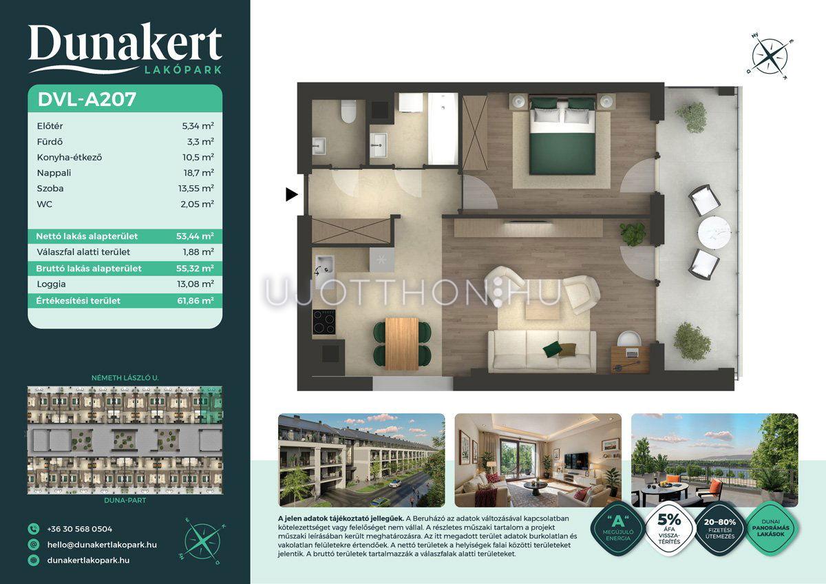 A Dunakert Lakópark Vác északi részén, a Németh László utcában épül, egy csendes, rendezett városrészben, közvetlenül a Duna-part mellett. A négyszintes épületben 152 modern, energiahatékony lakás kap helyet. A praktikus stúdióktól a nappali + több hálószobás családi otthonokig. Az emeleti lakásokhoz tágas terasz, a földszintiekhez saját kert tartozik, így minden lakó számára biztosított a privát kültéri tér és a természetkapcsolat.