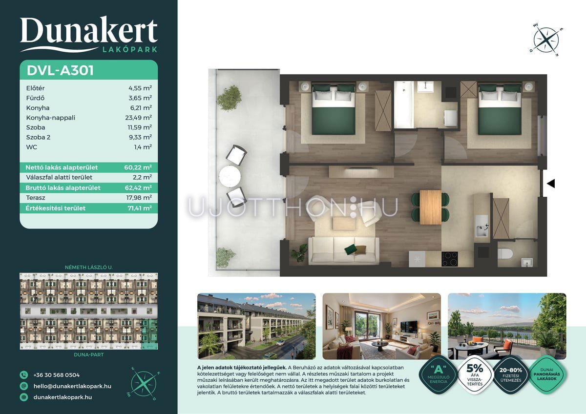 A Dunakert Lakópark Vác északi részén, a Németh László utcában épül, egy csendes, rendezett városrészben, közvetlenül a Duna-part mellett. A négyszintes épületben 152 modern, energiahatékony lakás kap helyet. A praktikus stúdióktól a nappali + több hálószobás családi otthonokig. Az emeleti lakásokhoz tágas terasz, a földszintiekhez saját kert tartozik, így minden lakó számára biztosított a privát kültéri tér és a természetkapcsolat.