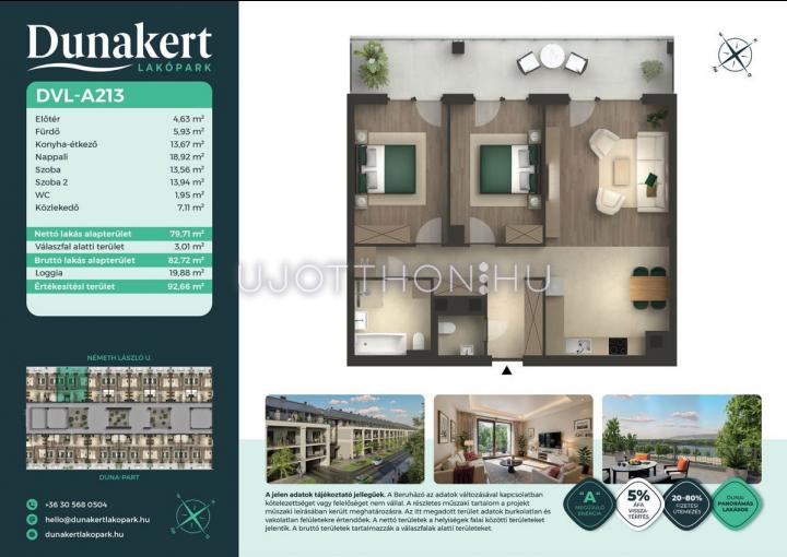 A Dunakert Lakópark Vác északi részén, a Németh László utcában épül, egy csendes, rendezett városrészben, közvetlenül a Duna-part mellett. A négyszintes épületben 152 modern, energiahatékony lakás kap helyet. A praktikus stúdióktól a nappali + több hálószobás családi otthonokig. Az emeleti lakásokhoz tágas terasz, a földszintiekhez saját kert tartozik, így minden lakó számára biztosított a privát kültéri tér és a természetkapcsolat.