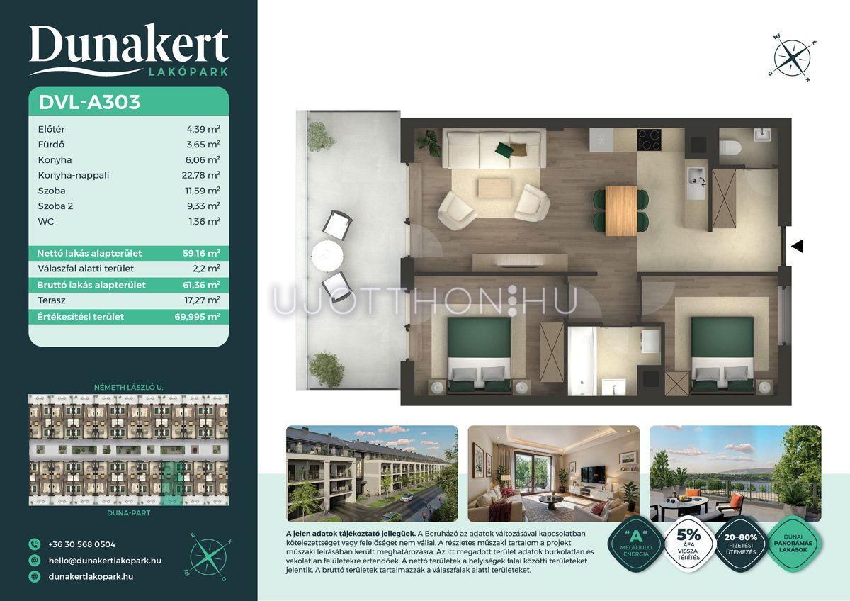 A Dunakert Lakópark Vác északi részén, a Németh László utcában épül, egy csendes, rendezett városrészben, közvetlenül a Duna-part mellett. A négyszintes épületben 152 modern, energiahatékony lakás kap helyet. A praktikus stúdióktól a nappali + több hálószobás családi otthonokig. Az emeleti lakásokhoz tágas terasz, a földszintiekhez saját kert tartozik, így minden lakó számára biztosított a privát kültéri tér és a természetkapcsolat.
