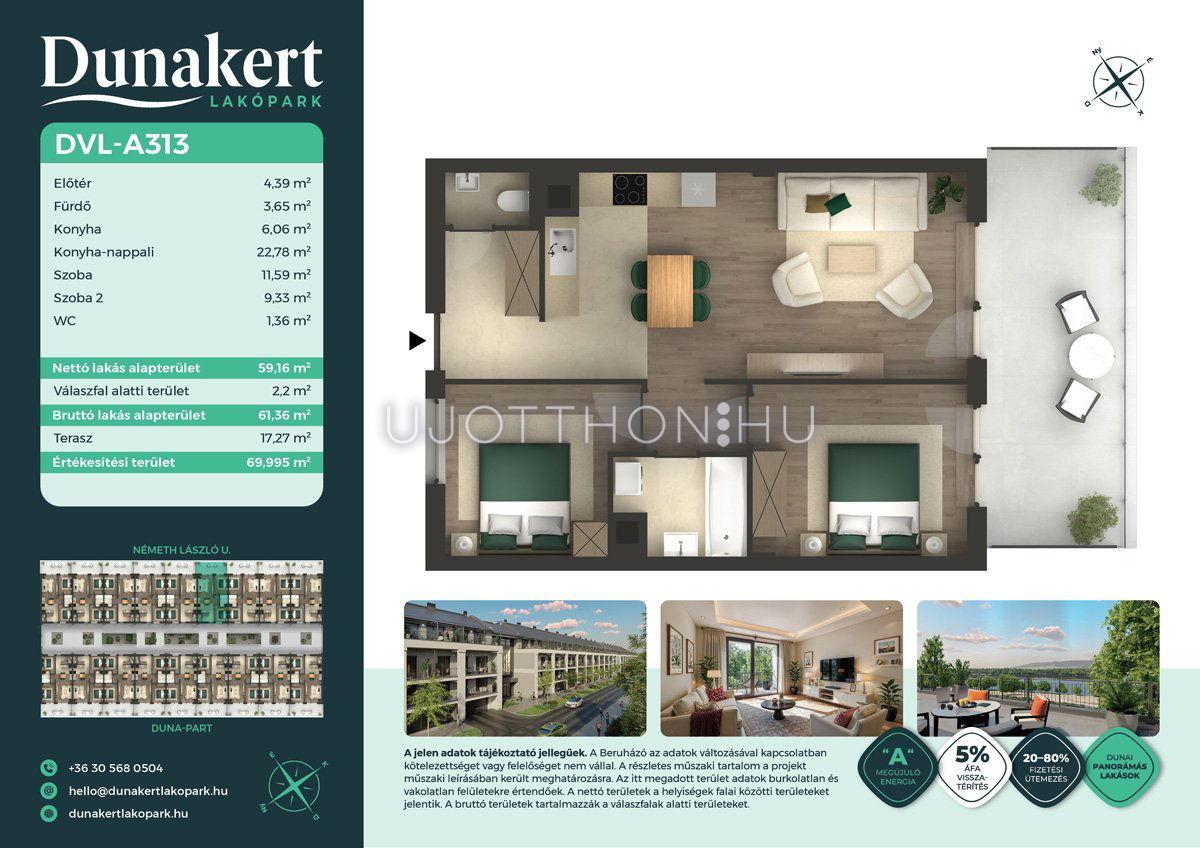 A Dunakert Lakópark Vác északi részén, a Németh László utcában épül, egy csendes, rendezett városrészben, közvetlenül a Duna-part mellett. A négyszintes épületben 152 modern, energiahatékony lakás kap helyet. A praktikus stúdióktól a nappali + több hálószobás családi otthonokig. Az emeleti lakásokhoz tágas terasz, a földszintiekhez saját kert tartozik, így minden lakó számára biztosított a privát kültéri tér és a természetkapcsolat.