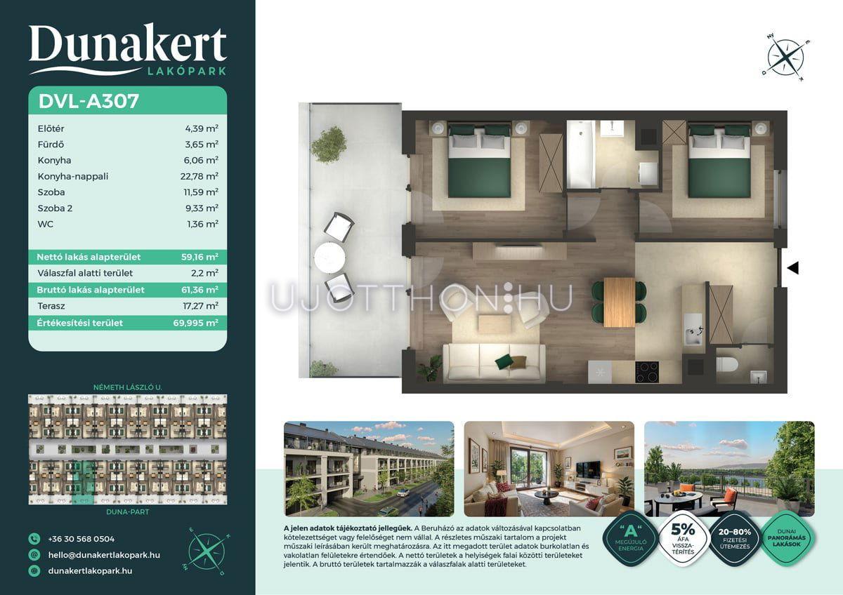 A Dunakert Lakópark Vác északi részén, a Németh László utcában épül, egy csendes, rendezett városrészben, közvetlenül a Duna-part mellett. A négyszintes épületben 152 modern, energiahatékony lakás kap helyet. A praktikus stúdióktól a nappali + több hálószobás családi otthonokig. Az emeleti lakásokhoz tágas terasz, a földszintiekhez saját kert tartozik, így minden lakó számára biztosított a privát kültéri tér és a természetkapcsolat.