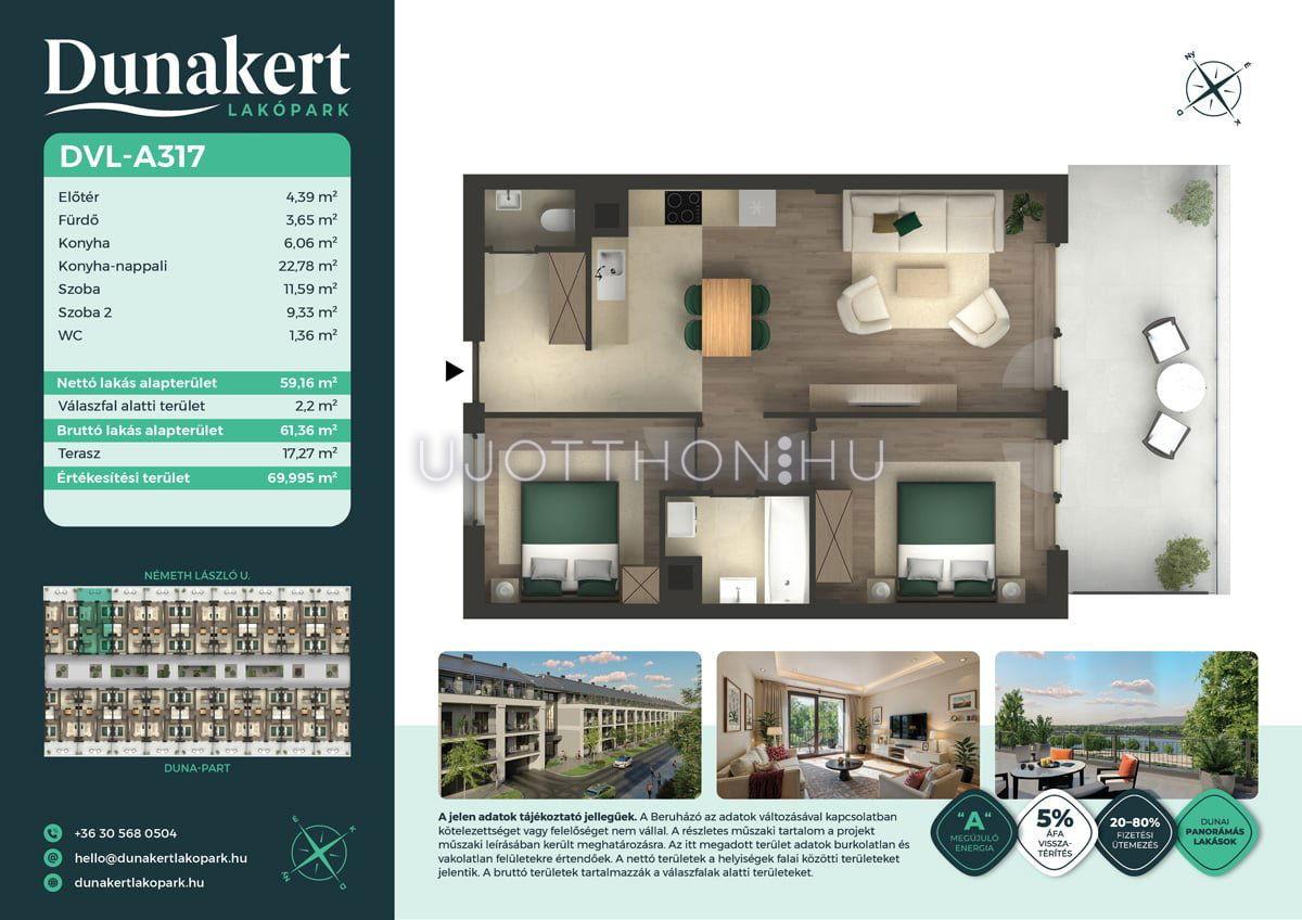 A Dunakert Lakópark Vác északi részén, a Németh László utcában épül, egy csendes, rendezett városrészben, közvetlenül a Duna-part mellett. A négyszintes épületben 152 modern, energiahatékony lakás kap helyet. A praktikus stúdióktól a nappali + több hálószobás családi otthonokig. Az emeleti lakásokhoz tágas terasz, a földszintiekhez saját kert tartozik, így minden lakó számára biztosított a privát kültéri tér és a természetkapcsolat.