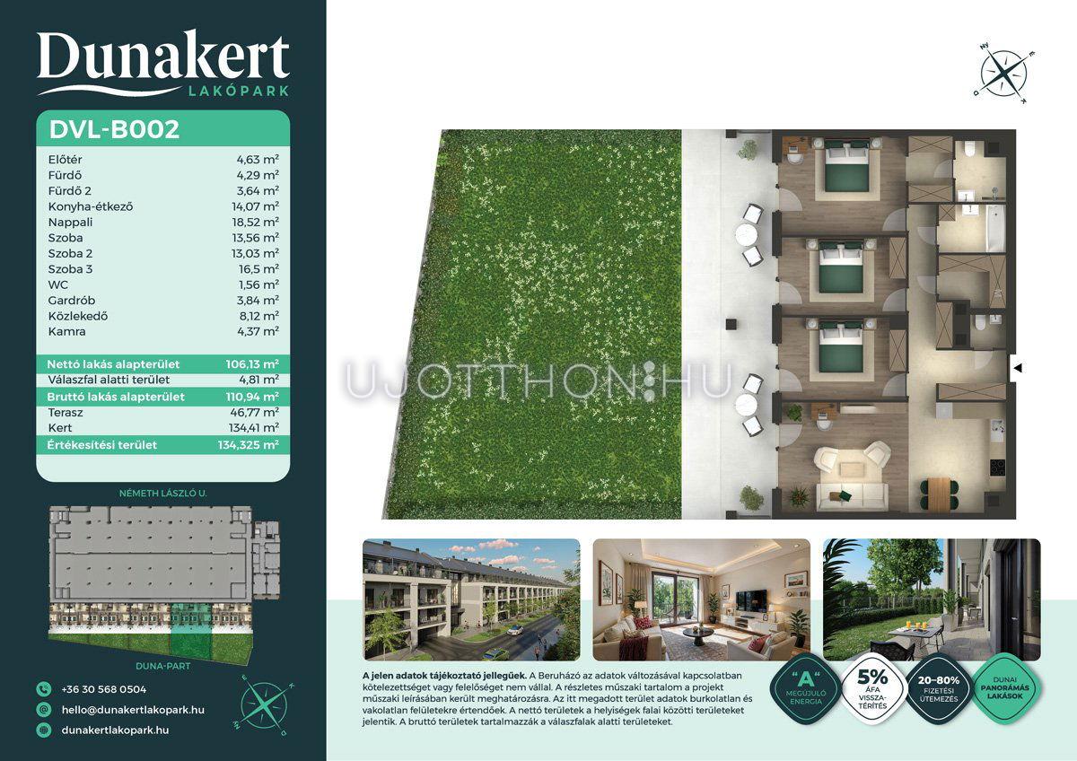 A Dunakert Lakópark Vác északi részén, a Németh László utcában épül, egy csendes, rendezett városrészben, közvetlenül a Duna-part mellett. A négyszintes épületben 152 modern, energiahatékony lakás kap helyet. A praktikus stúdióktól a nappali + több hálószobás családi otthonokig. Az emeleti lakásokhoz tágas terasz, a földszintiekhez saját kert tartozik, így minden lakó számára biztosított a privát kültéri tér és a természetkapcsolat.