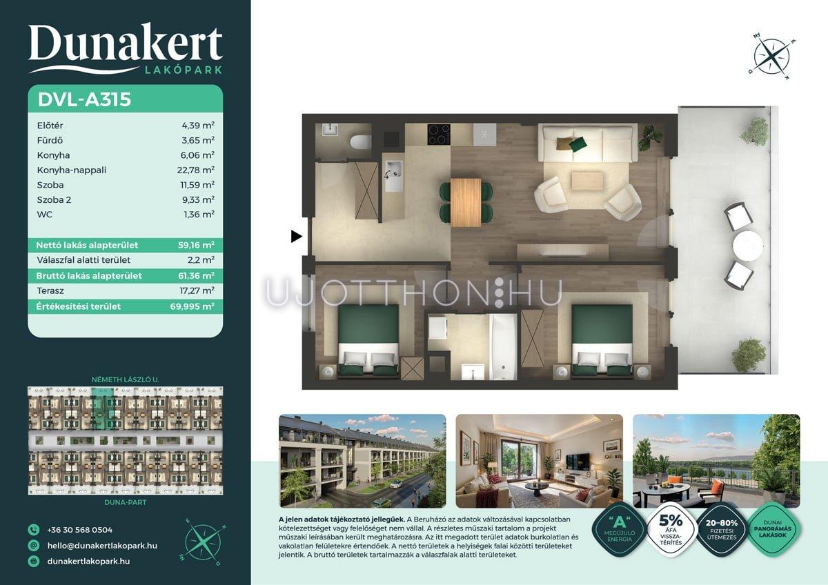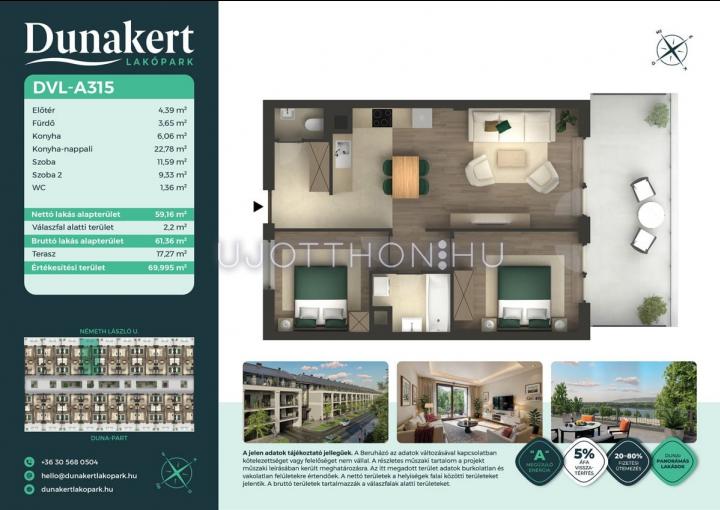 A Dunakert Lakópark Vác északi részén, a Németh László utcában épül, egy csendes, rendezett városrészben, közvetlenül a Duna-part mellett. A négyszintes épületben 152 modern, energiahatékony lakás kap helyet. A praktikus stúdióktól a nappali + több hálószobás családi otthonokig. Az emeleti lakásokhoz tágas terasz, a földszintiekhez saját kert tartozik, így minden lakó számára biztosított a privát kültéri tér és a természetkapcsolat.