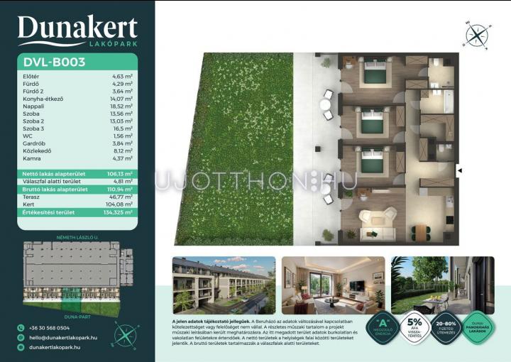 A Dunakert Lakópark Vác északi részén, a Németh László utcában épül, egy csendes, rendezett városrészben, közvetlenül a Duna-part mellett. A négyszintes épületben 152 modern, energiahatékony lakás kap helyet. A praktikus stúdióktól a nappali + több hálószobás családi otthonokig. Az emeleti lakásokhoz tágas terasz, a földszintiekhez saját kert tartozik, így minden lakó számára biztosított a privát kültéri tér és a természetkapcsolat.